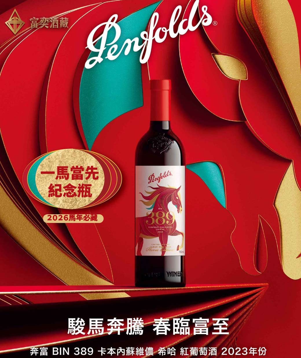 Bin 389 是奔富酒莊最具指標性的酒款之一,自 1960 年首發以來,因部分酒液於釀造過旗艦款 Grange(葛蘭許)的橡木桶中熟成,而被譽為「小葛蘭許 (Baby Grange)」。此款 2023 年份特別推出「馬年限量紀念瓶」,瓶身設計融合了傳統剪紙藝術與現代生肖美學,象徵奔騰與祥瑞,極具收藏價值。