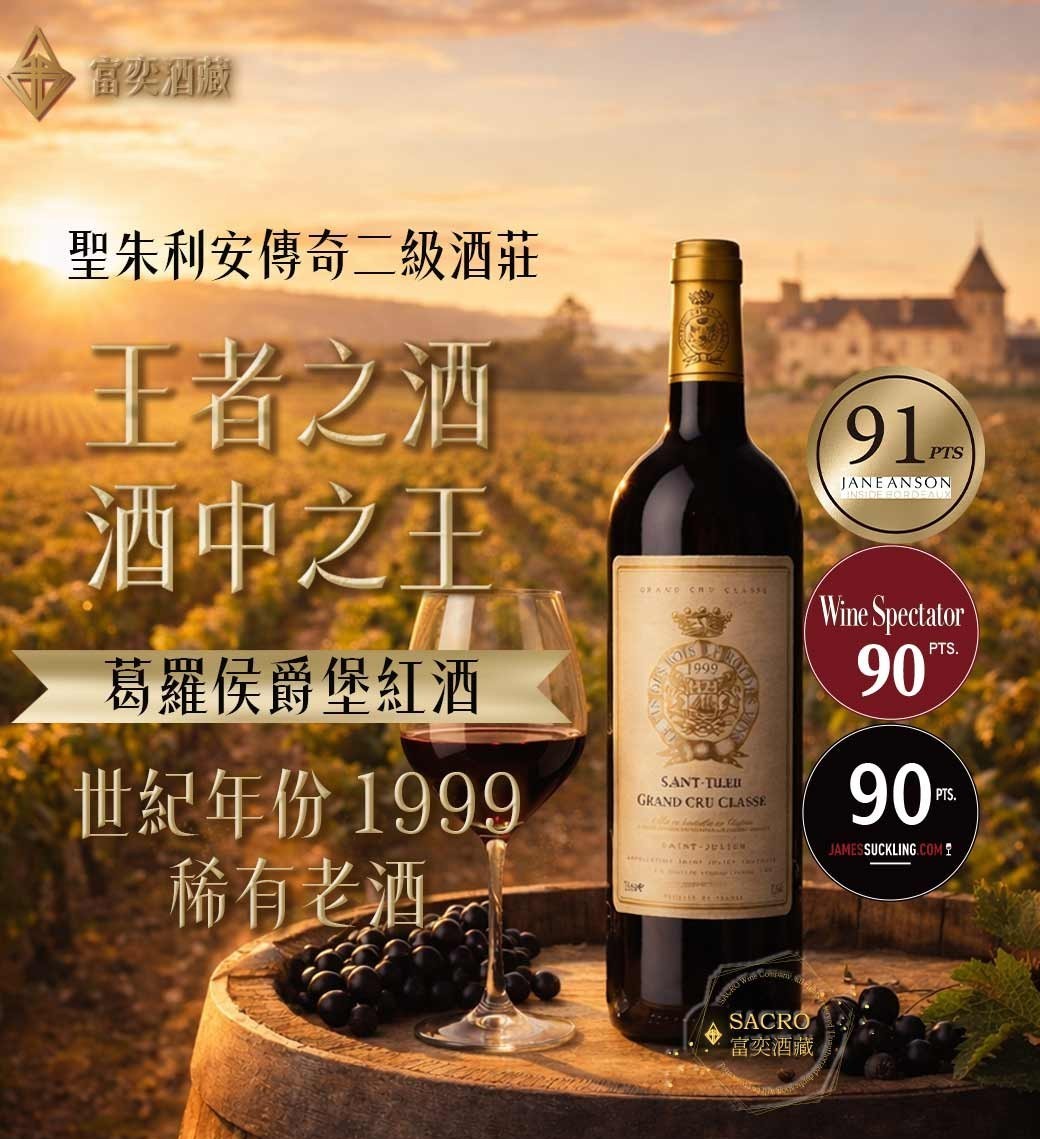 酒款介紹:1999 年份的波爾多是一個展現「精緻與優雅」的年份。相較於鄰近強勁的 2000 年,1999 年的葛蘿拉蘿斯堡(Château Gruaud Larose)更早進入適飲期,並展現出聖朱利安(Saint-Julien)產區細膩、和諧的一面。這款二級莊一軍紅酒在傳統的長木桶中陳年,並透過嚴格的選果程序,確保了酒質的純淨度與平衡感,是追求老派波爾多經典風格收藏家的首選。 |