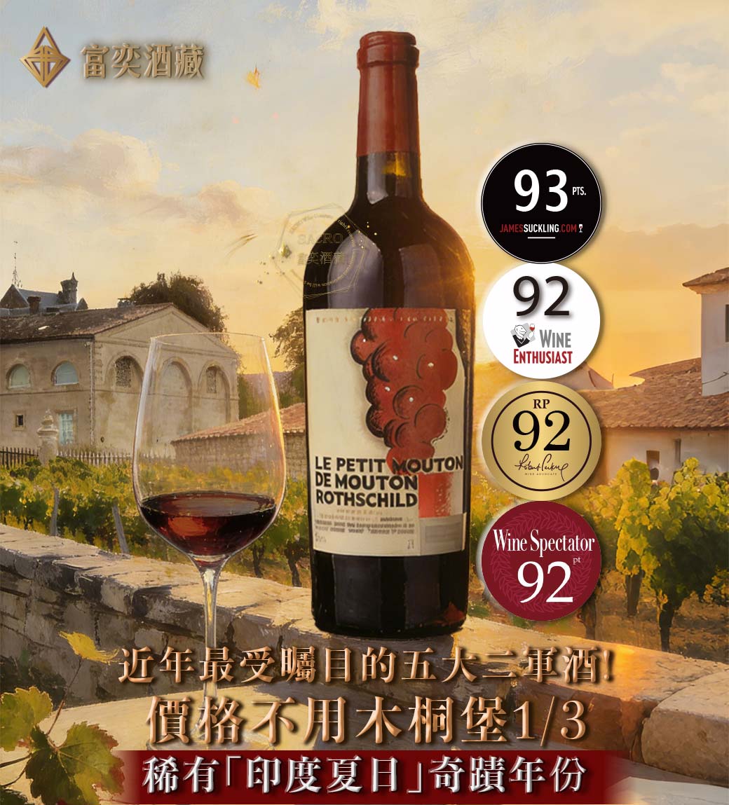 酒款介紹:Le Petit Mouton 是波爾多五大酒莊「木桐堡」(Château Mouton Rothschild)所精心打造的二軍酒。自 1993 年正式問世以來,其品質與身價始終位居二軍酒的首選。2014 年份的 Petit Mouton 展現了該年份波雅克產區的卓越結構,葡萄來自於酒莊精心挑選的年輕葡萄藤,並採用與一軍酒相同的嚴謹採收與釀造工藝,是親近五大酒莊貴族血統的最佳途徑。 |
