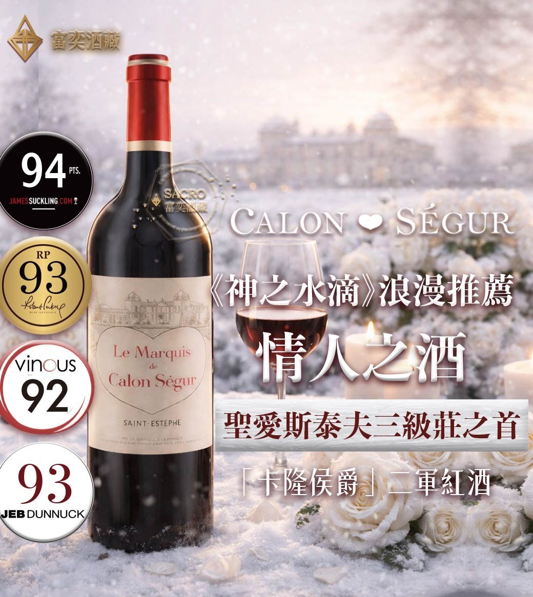 酒款介紹:「卡隆侯爵」(Marquis de Calon)是聖愛斯臺夫三級名莊卡隆塞居堡(Château Calon Ségur)的二軍紅酒。這款酒不僅繼承了正軍酒莊的貴族血統,更強調了即飲性與果味的純粹感。2023年份受惠於精準的採收與釀造工藝,展現出平衡且深邃的結構。其酒標同樣帶有酒莊標誌性的「心形」符號,象徵著前莊主塞居侯爵對這片土地的深情,是情人節或紀念日送禮的首選。 |